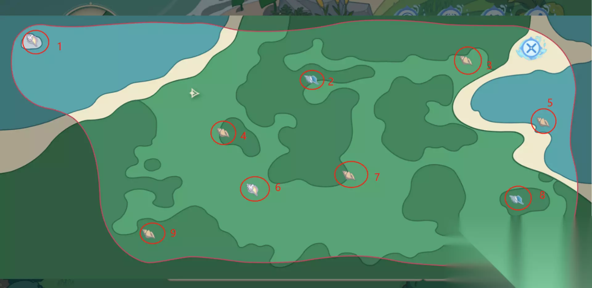 打开活动左上角的地图,可以看到10个海螺的大概位置