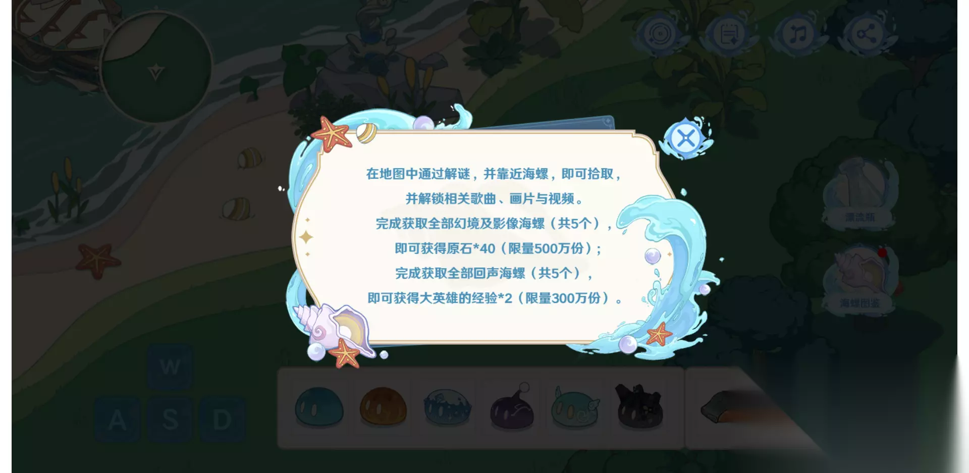 螺音忆梦活动 活动说明 活动主要通过地图解谜获取10个海螺,解锁歌曲、画片与视频,解锁后可获得40原石、大英雄的经验*2