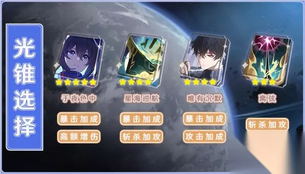 3、希儿光锥推荐 光锥【于夜色中】可以为希儿提升希儿的暴击率并依据希儿速度值超过100的部分为希儿的普攻和战技提供增伤,为希儿的终结技提供暴击伤害加成,十分利好高速度的希儿,是希儿光锥的最优选择。 光锥【星海巡航】可以为希儿提供暴击率加成,并提升希儿的收割能力与连续斩杀能力,对于希儿而言该光锥也是十分优秀的选择。 光锥【唯有沉默】可以为希儿提供攻击力加成,当场上敌人不多于2时还会提升希儿的暴击率,虽然环境有所限制但对于希儿而言也是不错的选择。 光锥【离弦】可以让希儿消灭敌人后获得高额攻击力加成,与希儿的天赋有一定联动效果,可以作为过渡光锥携带。