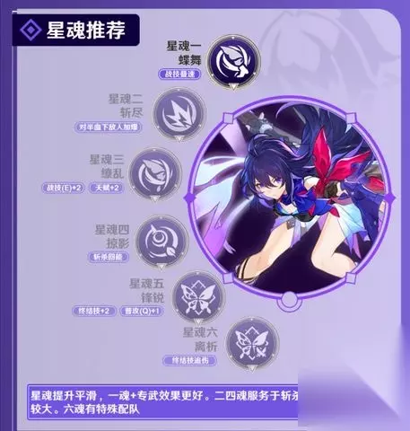 4、希儿星魂推荐 希儿的星魂推荐星魂一蝶舞。 星魂提升平滑,一魂+专武效果更好。二四魂服务于斩杀,三魂数值提升较大。六魂有特殊配队。
