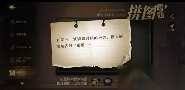9.22拼图寻宝: (一) 拼图信息:在哈利·波特最讨厌的地方,巨大的生物占领了那里…… 拼图位置:城堡主楼—魔药课教室(教室内左后方)—霍拉斯·斯拉格霍恩教授对话打败巨鼠