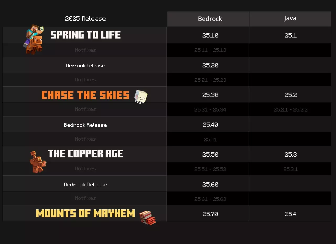 这里有一个基于2025年的例子。2025年,我们发布了三款游戏(《春天复活》、《追逐天空》和《铜时代》),还有一款即将推出——《狂热山脉》!以2025年为例,将新的版本编号系统应用起来,你可以更好地了解Bedrock和Java的相似之处和差异!