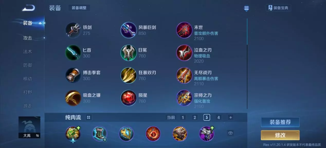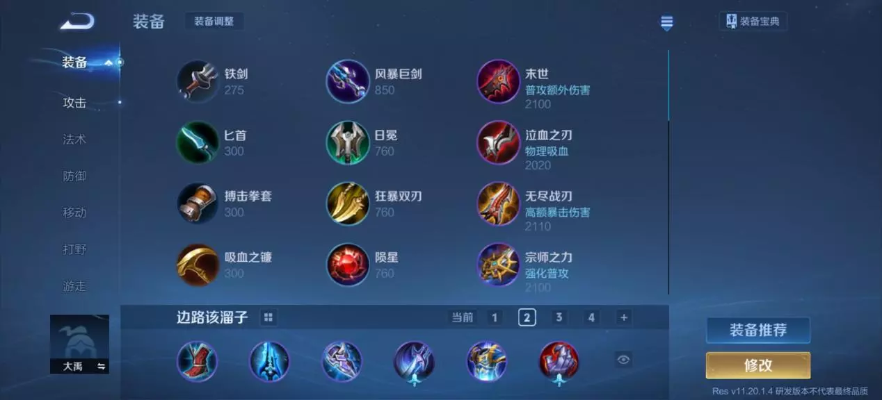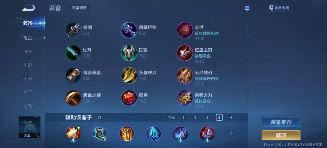 辅助装的话就选择极影,能够提供攻速与冷却,这也是大禹自身比较需要的,出完黄盾后就有一定坦度,然后再出寒霜袭侵消耗减速对面,最后再补上苍穹加血魔,增加伤害的同时也能提高容错。