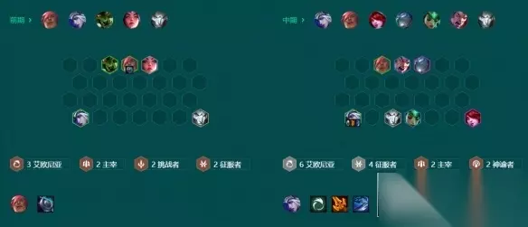 五、搜牌节奏 在3-2阶段升6人口,先大D出两星艾希和瑟提,有霞可以搭配德莱厄斯开4征服者。无霞就用瑟提+沃里克+诺提勒斯+德莱厄斯先开4主宰。之后存钱慢D三星,最晚在4-5之前D出三星艾希和瑟提。 搜出三星寒冰可以直接升7人口,在7人口继续D三星瑟提和6艾欧4征服者羁绊。羁绊质量达标后可以存钱升人口,8人口补一个堡垒,能升9人口就补阿狸的上限,替换掉卡尔玛。前排可以补亚克托斯或奎桑提,后排可以用黑默丁格或瑞兹。 六、克制分析 这套阵容大成上限非常高,下限强度也够,能做出艾欧转且节奏不落后基本上稳分。后期比较怕大成的枪手。 金铲铲之战