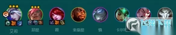 四、早期过渡 最佳使用条件:2-1出艾欧转、可拿海牛阿福去开艾欧转、城邦是班德尔自助餐厅或普雷西典书库、2阶段选秀有铲子,拿了做艾欧转。无转职也可以玩,但强度会下降,需要8人口才能开出6艾欧4征服者,艾希没艾欧转可以做鬼索的狂暴之刃。前期用3艾欧2征服者过渡,可以先做薄雾法袍增加后排输出。