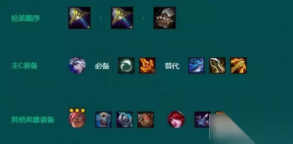 二、装备分析 征服者自带暴击,艾希优先做攻击装备,锐利之刃增加的伤害是最高的。第三件优先补巨人捕手,可以更快处理四费卡和三星阵容。其次可以做无尽之刃增加爆伤,卢安娜的飓风增加平A伤害。副C选择霞,依旧是攻击力装备优先。 主T是三星瑟提,能做出薄雾法袍后排就无需做最后的轻语。最佳选择圣盾使的誓约和棘刺背心两件套。法系阵容多可以换成巨龙之爪。