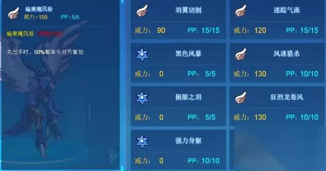 强力身躯:攻击+2 防御+1 特防+1,补偿一个先出手时2回合免疫异常状态。让这个精灵还是得玩高速,只要高速起来就根本不怕控苟。 暗黑飓风斩:先出手时50%几率使对手害怕;直接把以前的一个害怕控绑定在技能上,让玩家强化完后直接可以突突。