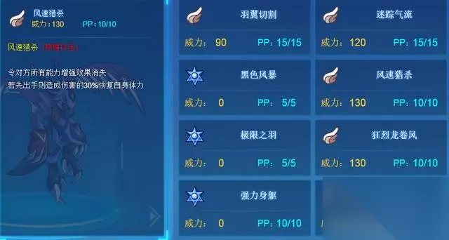 黑色风暴:使对手攻击-1 特攻-1 命中-2,先出手时自身速度+1;弱化效果加持一个强化速度+1效果,只要回合开始前弱化,一个弱化就拿到了优势。双攻-1+命中-2,大大的削弱了对手输出能力。 风速猎杀:消强的同时还补偿一个先手造成伤害的30%恢复自身体力。