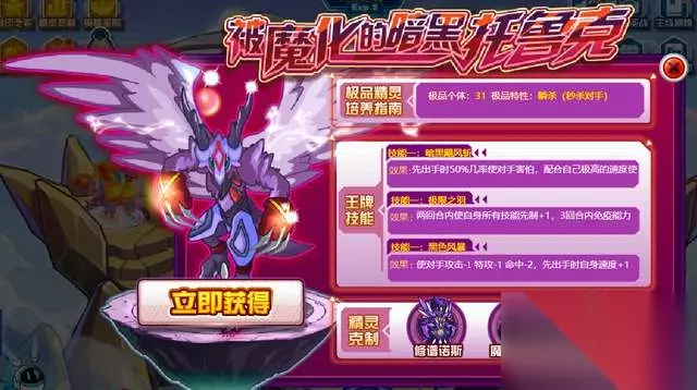 二、精灵介绍 黑化之后的托鲁克,因为上线是在2013年年末,所以技能组总和肯定是有了飞跃性的提升,要不然玩家都买了金翅托鲁斯(金翅托鲁克之子),那谁还买它。不过现在看设定的话,好像托鲁克和金翅托鲁克并非一个精灵,就比如圣光天马和黄金天马。