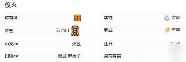 仪玄,游戏《绝区零》中的S级玄墨属性命破角色,于2.0版本“云霞同归处”上线。 “云岿山”第十三代门主,也是被市长梅弗劳尔亲自认可的虚狩级调查员,不过行事风格颇为随意,很多时候即使是言传身教,弟子们也只能用“揣测”的方式来了解师父的本意。 仪玄具有特殊的“玄墨”属性,是一名能对敌人造成无视防御贯穿伤害的输出型代理人。她可以通过消耗其独特的能量“闪能”获取“术法值”。在“术法值”充足时,仪玄可通过消耗全部“术法值”释放一次特殊的终结技,并随后获得一次“玄墨极阵”的使用次数。 代理人信息