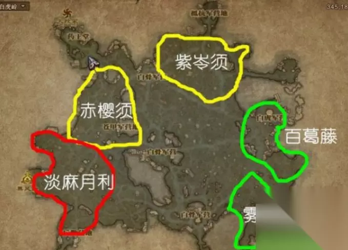 3、三级药材:赤缨须,紫苓须 地图:白虎岭 坐标233.405(赤缨须)白骨军营附近,有主攻怪。 坐标486.391(紫苓须)白骨军营附近,有主动怪 4、四级药材:雾葛藤,百褐藤 地图:白虎岭,黄风岭,黑风山 坐标180.420(雾葛藤)白虎岭 百褐藤没有坐标在黑风山满地图都是你就顺道溜达,但是有巡山大狗熊。十分恶心。在黄风岭也有坐标456.187。这玩意做出的百褐藤茎也是做任务必需品。在内侧建议早学,可以捞一笔。不解释你们懂得