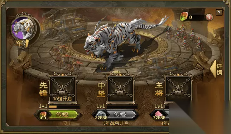 典韦出战的话要根据装备选择战法攻击,要是马超的话它的格挡率高,所以可以抗住更多的伤害。 最后一个位置是夏侯惇,它是收割武将可以抗住太史慈的伤害。 出战时千万别丢技能,因为太史慈格挡率太高,所以战法要留着最后丢。 白虎出战方式 白虎的战斗力非常高,想要出战需要再游戏里选择一个你要打的敌国城池,接着菜单会出现召集设置,点击作战状态就可以选择武将加入战斗。紧接着是选择战兽,你可以左下角选择你要出战的战兽,等你的进度条达到以前后,战兽就会出来跟你一起作战了。进度条需要你派遣武将攻城才会增加,而且是不需要手动释放的,只要进度条满就可以直接出战。选择自动作战的玩家会自动释放战兽,但要是手动操作的还需要自己手动选择召唤才会放出白虎。白虎的攻击力根本自己的等级有关系,想要解锁这个战兽还要在战兽界面才能招募出来。
