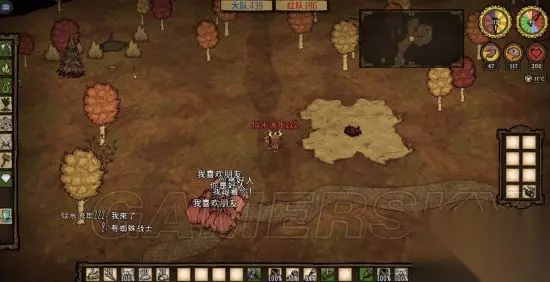 猪王争霸说白了其实是掠夺猪屋材料的游戏,哪一方获得的猪屋材料多基本就奠定了胜利的基础,也不是唯一,后面慢慢说,几个玩的不错的队友前期发展非常快。如果你想带节奏建议前期不要恋战,比较拖节奏,能跑就跑,对面往死了追那也没办法,一般前期穷追不舍得比较少。 前期直接对战我感觉7分靠网速3分靠技术,网速好的一般会比网速差的出手快一点,走位相当风骚的除外,前期还是以收集材料为主。下面说一下前期发展过程。以女武神为例,女武神虽然只吃肉,度过前两天,后期生存比较安逸,因为她打怪可以回血回精神,自己可以做武器装备(材料比较简单)。这个版本的老奶奶比较鸡肋,不像以前睡前故事可以睡人,现在只是减速,读书掉脑残哗哗的,还不能睡觉,所以不建议用。 第一天出门直接沿着主路走就行有什么材料捡什么材料,饥荒三要素——草、树枝、燧石,天黑之前尽量最少找到一个金子,采集一个镐子的石头,最好不能拖到第二天晚上,饱食度一般是到第二天傍晚就掉0了,实在撑不住就烤块肉吃,路上看着周围有没有猪人房,尽早砸烂带回家。
