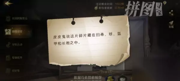 哈利波特魔法觉醒拼图寻宝10.24位置在哪里?具体的碎片位置不知道各位找到了吗?还没有找到了玩家们就和小编一起来看看今天碎片的具体位置吧。 哈利波特魔法觉醒拼图寻宝第四期第五天10.24碎片位置大全 1、拼图信息:皮皮鬼说这片碎片藏在扫帚,球,盔甲和长袍之中。