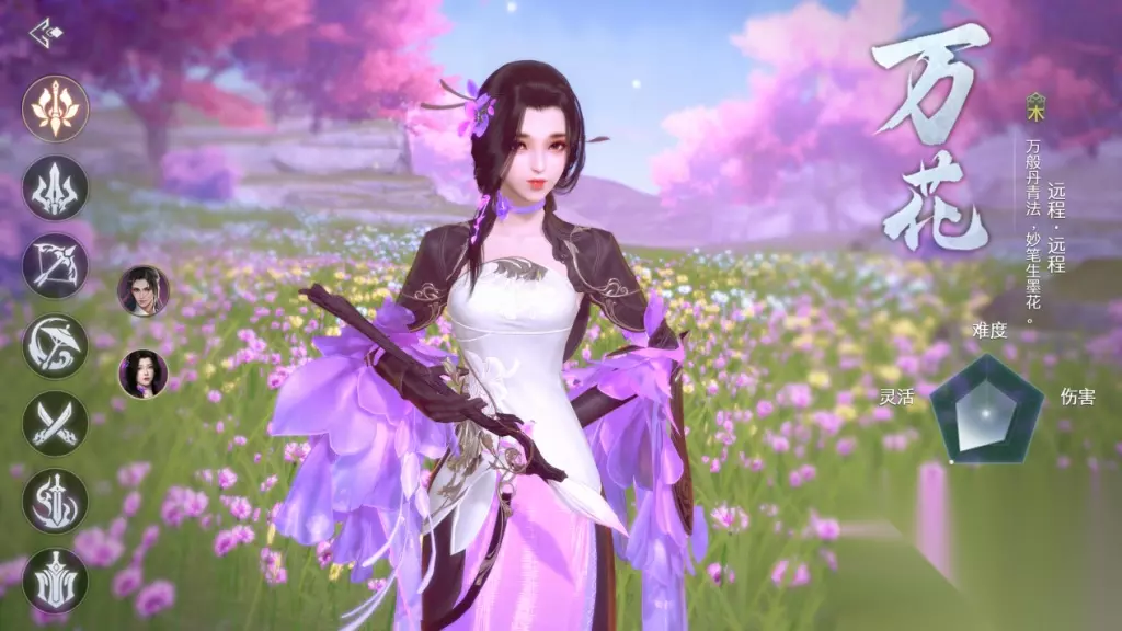最后是万花门派,他们的五行属性是木,可以输出和增益灵活切换。万花使用毛笔作为武器,并且克制武当门派。万花门派是一个双技能组,既具备输出能力,又能进行治疗增益,是一个全能型选手。推荐选择秘籍太玄经、紫霞神功和天山六阳掌,同时搭配霸王扛鼎、柔中带刚和内息澎湃。