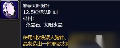 【魔兽wlk怀旧服攻略汇总】 魔兽世界wlk邪恶太阳胸针怎么制作 答:铁矮人胸针*1+茶晶石*1+太阳水晶*1 详细介绍 1、玩家可通过采集纯净的萨隆邪铁矿脉、富钴矿脉、富萨隆邪铁矿脉等获得【太阳水晶】、【茶晶石】;