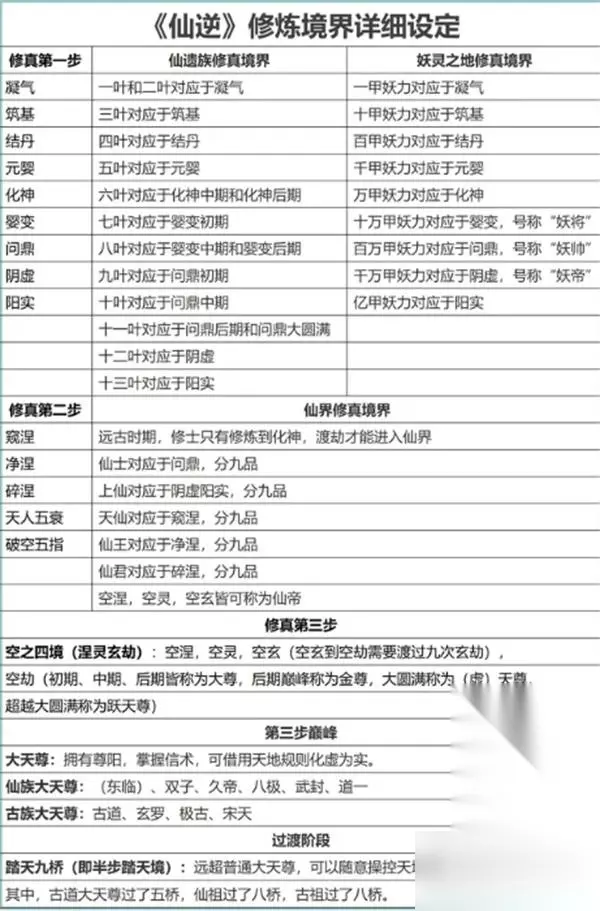 修真第一步: 1、凝气期:修炼者的起始阶段,感应天地灵气,凝聚于体内,形成气旋,共十五层,大圆满后可筑基。此阶段可施展法术和产生神识,是修仙的基础。 仙遗族修真境界:一叶和二叶对应于凝气 妖灵之地修真境界:一甲妖力对应于凝气 2、筑基期:将凡体蜕变为更适合修炼的体质,使灵力运转更加流畅,为后续修炼打基础。该阶段存在极境,达到极境者同境界几乎无敌。 仙遗族修真境界:三叶对应于筑基 妖灵之地修真境界:十甲妖力对应于筑基 3、结丹期:把灵力从无形化为有形,再从有形化为液体成金丹。结丹期对应的战力约为一星古神。 仙遗族修真境界:四叶对应于结丹 妖灵之地修真境界:百甲妖力对应于结丹 4、元婴期:体内金丹碎掉诞生元婴,有逃脱轮回的可能,即便肉体损毁也不算真正死亡。 仙遗族修真境界:五叶对应于元婴 妖灵之地修真境界:千甲妖力对应于元婴 5、化神期:感悟天地人生产生意境,让意境与元婴融合形成元神,达到元神不灭则灵魂不灭的境界。化神境界对应的是二星古神的战力。 仙遗族修真境界:六叶对应于化神中期和化神后期 妖灵之地修真境界:万甲妖力对应于化神 6、婴变期:婴变是化神期的意境实体化,将灵力转变为仙力,把凡人的肉身之躯转化为仙躯,元神转为实体并和仙躯融合为一,对应的是地仙层次。 仙遗族修真境界:七叶对应于婴变初期 妖灵之地修真境界:十万甲妖力对应于婴变,号称“妖将” 7、问鼎期:利用仙力与意境融合形成问鼎之精,初步拥有元力,对应的是上仙境界的三星古神战力。 仙遗族修真境界:八叶对应于婴变中期和婴变后期 妖灵之地修真境界:百万甲妖力对应于问鼎,号称“妖帅” 8、阴虚期:问鼎之后的过渡时期,阴虚改变元神使其能直接吐纳天地产生元力。 仙遗族修真境界:九叶对应于问鼎初期 妖灵之地修真境界:千万甲妖力对应于阴虚,号称“妖帝” 9、阳实期:问鼎之后的过渡时期,阳实是化元完成。 仙遗族修真境界:十叶对应于问鼎中期 妖灵之地修真境界:亿甲妖力对应于阳实 仙遗族修真境界:十一叶对应于问鼎后期和问鼎大圆满 仙遗族修真境界:十二叶对应于阴虚 仙遗族修真境界:十三眼三叶对应于阳实