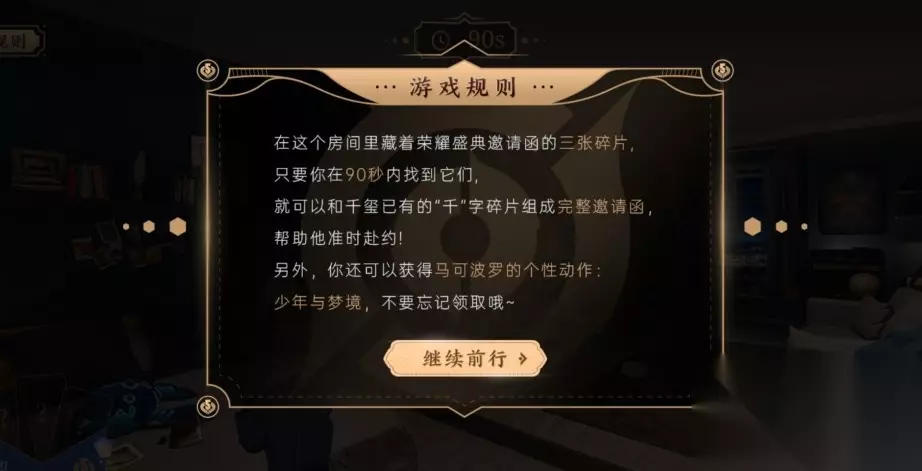 很多玩家是没有听易烊千玺的那个提示视频而选择自己跳过,其中那里面是有些许线索的,注意听和看。 活动规则:在这个房间藏着荣耀盛典邀请函的三张碎片,只要你在90秒内找到它们,就可以了,奖励就是专属动作马克波罗的少年与梦境。 【小编推荐】专区入口 || 视频站入口 || 体验服申请入口 || 全民竞猜赢好礼 【新英雄爆料】| 司马懿 || 瑶 || 孙策 || 新英雄:囚徒/书圣/瞬 | 【新皮肤爆料】| 李白团战皮肤:敏锐之力new || 诸葛亮团战皮肤:掌控 || 典韦穷奇皮肤 Hot!! | 王者荣耀最新攻略 赛季段位继承表 每日一题 边境突围玩法攻略 体验服爆料