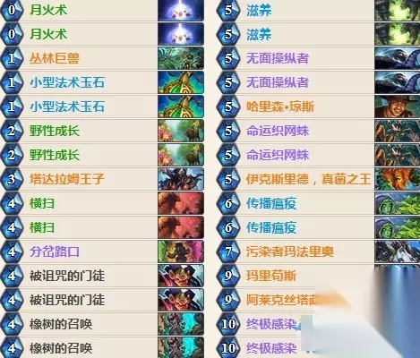 卡组代码:AAECAZICCLQDxQSQB4vBAp7SApnTAp3iAqPmAgtAX9MDkwTkCPfMAqDNAofOApjSAprkAoTmAgA= 卡组思路 伊克斯里德,真菌之王 524的身材,看起来确实很差,而且需要有嘲讽墙的保护,不过效果是你在召唤一个随从,比如召唤一个蓝龙,他就复制一个蓝龙,你用无面复制一个蓝龙也会触发复制一个蓝龙,那就相当厉害了。 月火术+蓝龙+横扫 有了蓝龙的月火术伤害是0费打6,如果是双蓝龙那就是11,四蓝龙就是21点伤害,最高可以弄到六蓝龙那就是31点伤害!不过显然有11点伤害就已经足够高的斩杀能力了。 丛林巨兽 召唤5个攻击力大于5的就会完成任务,送一个班布那斯的随从!因为卡组里几乎都是攻击力大于5的随从,也比较容易完成该任务。 那么关于德鲁伊有什么新卡组呢?小编为大家准备了《炉石传说》女巫森林德鲁伊卡组推荐的介绍。