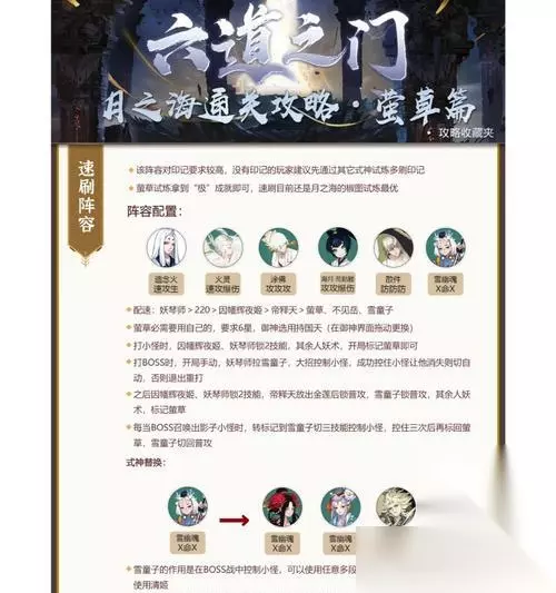 三、式神搭配与配置建议 为了更好地应对离封莹草,搭配合适的式神组合至关重要: 封印式神:如阎魔、御馔津,可以有效控制离封莹草的输出与治疗。 强攻式神:如玉藻前、茨木童子,可迅速削减离封莹草的血量。 支援式神:如追月神、书翁等,可为队友提供额外的增益和续航支持。