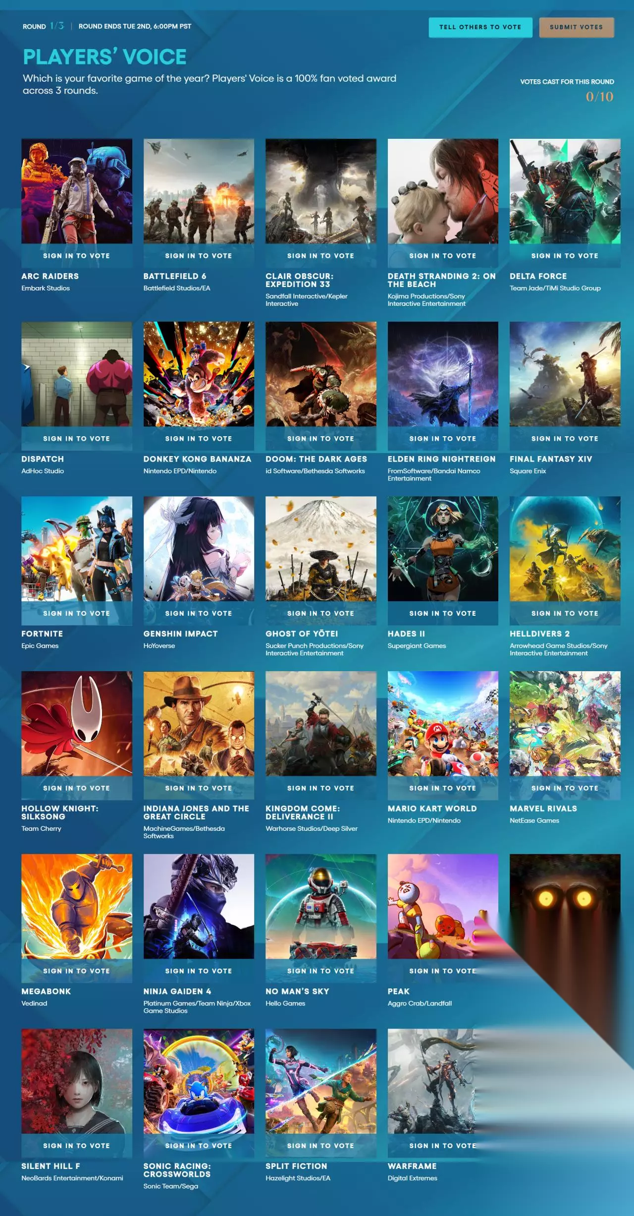 《穹顶突击队》《战地6》《光与影:33号远征队》《死亡搁浅2:冥滩之上》《三角洲行动》《超英派遣中心》《咚奇刚:蕉力全开》《毁灭战士:黑暗时代》《艾尔登法环:黑夜君临》《最终幻想14》《堡垒之夜》《原神》《羊蹄山之魂》《哈迪斯2》《绝地潜兵2》《空洞骑士:丝之歌》《夺宝奇兵:古老之圈》《天国:拯救2》《马力欧卡丁车:世界》《漫威争锋》《Megabonk》《忍者龙剑传4》《无人深空》《PEAK》《R.E.P.O.》《寂静岭f》《索尼克赛车 交叉世界》《双影奇境》《星际战甲》《鸣潮》