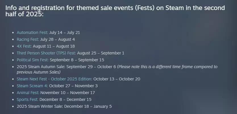 2025年下半年Steam主题特卖和节日活动时间:自动化游戏节:7月14日 – 7月21日竞速游戏节:7月28日 – 8月4日4X游戏节:8月11日 – 8月18日第三人称射击游戏节:8月25日 – 9月1日政治模拟游戏节:9月8日 – 9月15日2025年Steam秋季促销:9月29日 – 10月6日(请注意,与以往的秋季促销时间不同)2025 年 10 月新品节:10月13日 – 10月20日尖叫游戏节 4:10月27日 – 11月3日动物游戏节:11月10日 – 11月17日体育游戏节:12月8日 – 12月15日2025年Steam冬季促销:12月18日 – 1月5日