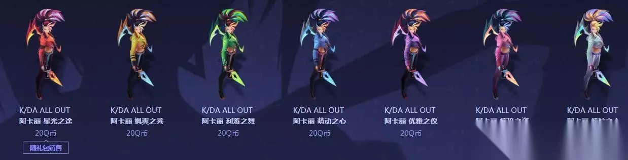 KDA ALL OUT阿卡丽 炫彩皮肤礼包 售价:175.21Q币 限时销售:10月30日12:00-11月13日9:59 礼包包含:皮肤(8折)+图标(含载入边框)(8折)+6款炫彩(8折),随礼包出售的【K/DA ALL OUT 阿卡丽 惊艳之姿】仅售0.01Q币