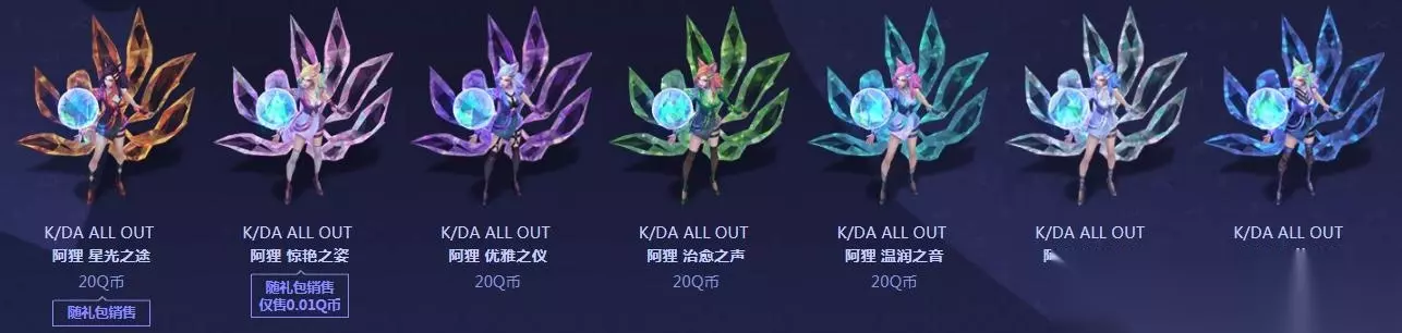 KDA ALL OUT阿狸 炫彩皮肤礼包 售价:175.21Q币 限时销售:10月30日12:00-11月13日9:59 礼包包含:皮肤(8折)+图标(含载入边框)(8折)+6款炫彩(8折),随礼包出售的【K/DA ALL OUT 阿狸 惊艳之姿】仅售0.01Q币