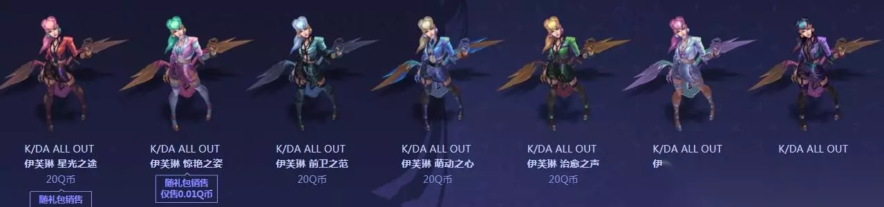 KDA ALL OUT 伊芙琳炫彩皮肤礼包 售价:175.21Q币 限时销售:10月30日12:00-11月13日9:59 礼包包含:皮肤(8折)+图标(含载入边框)(8折)+6款炫彩(8折),随礼包出售的【K/DA ALL OUT 伊芙琳 惊艳之姿】仅售0.01Q币