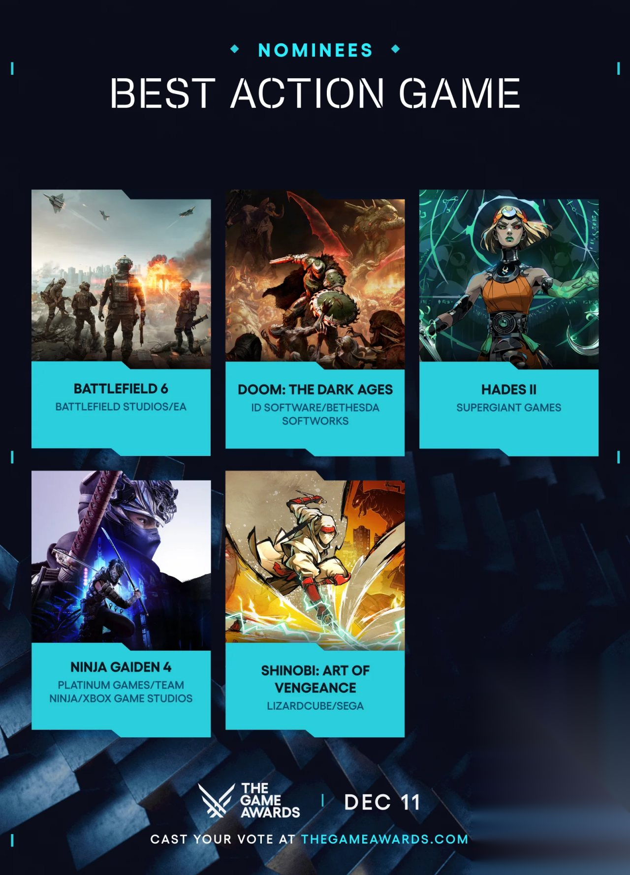 最佳动作游戏《战地6》《毁灭战士:黑暗时代》《哈迪斯2》《忍者龙剑传4》《超级忍 反攻的斩击》