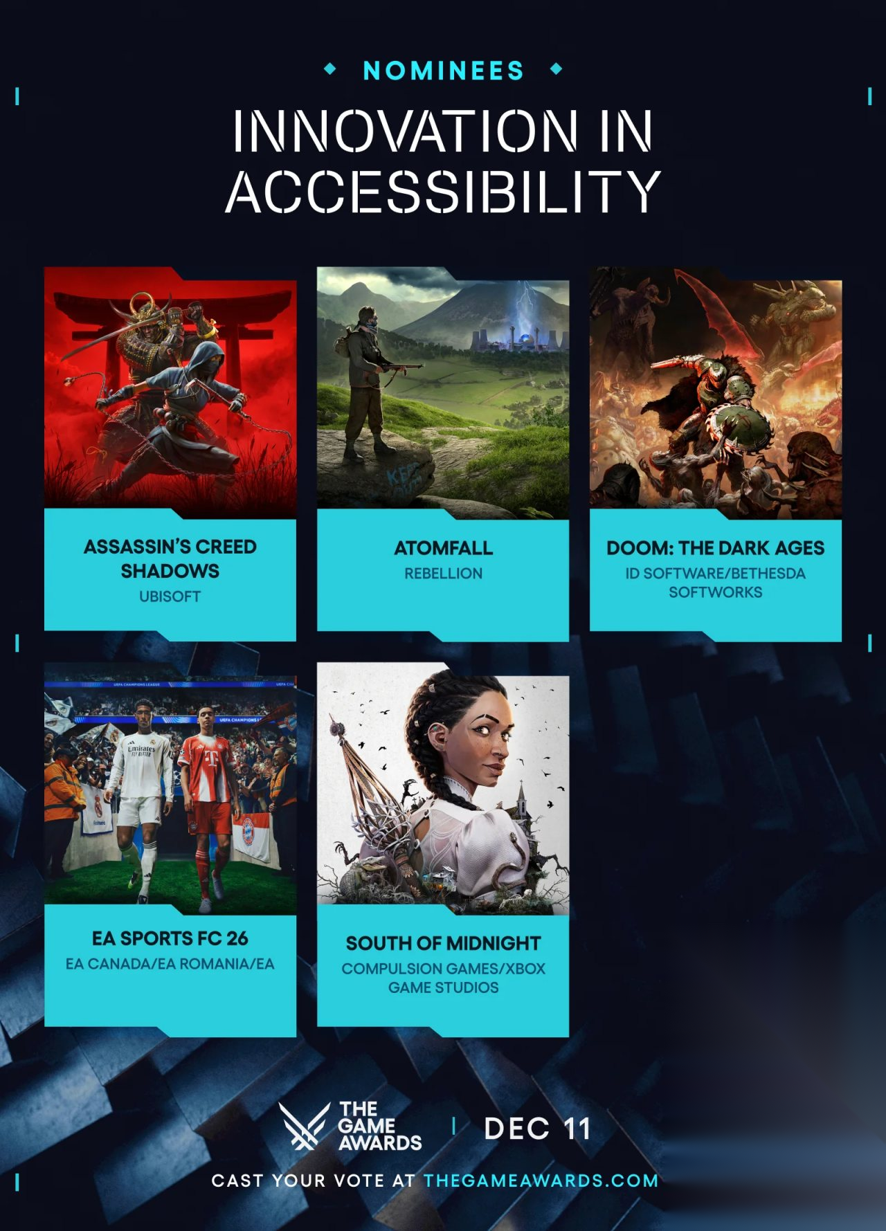 无障碍创新《刺客信条:影》《原子陨落》《毁灭战士:黑暗时代》《EA Sports FC 26》《午夜之南》