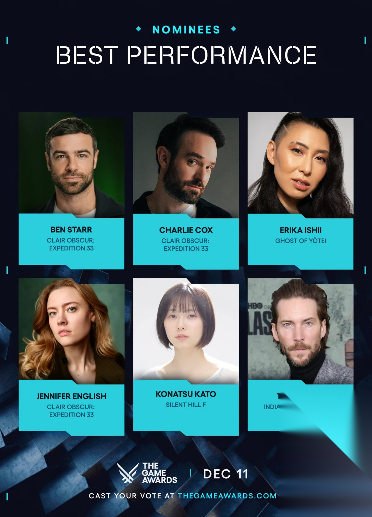 最佳表演Ben Starr (维尔索,《光与影:33号远征队》)Charlie Cox (古斯塔夫,《光与影:33号远征队》)Erika Ishii (笃,《羊蹄山之魂》)Jennifer English (玛埃尔,《光与影:33号远征队》)加藤小夏(深水雏子,《寂静岭f》)Troy Baker (印第安纳·琼斯,《夺宝奇兵:古老之圈》)