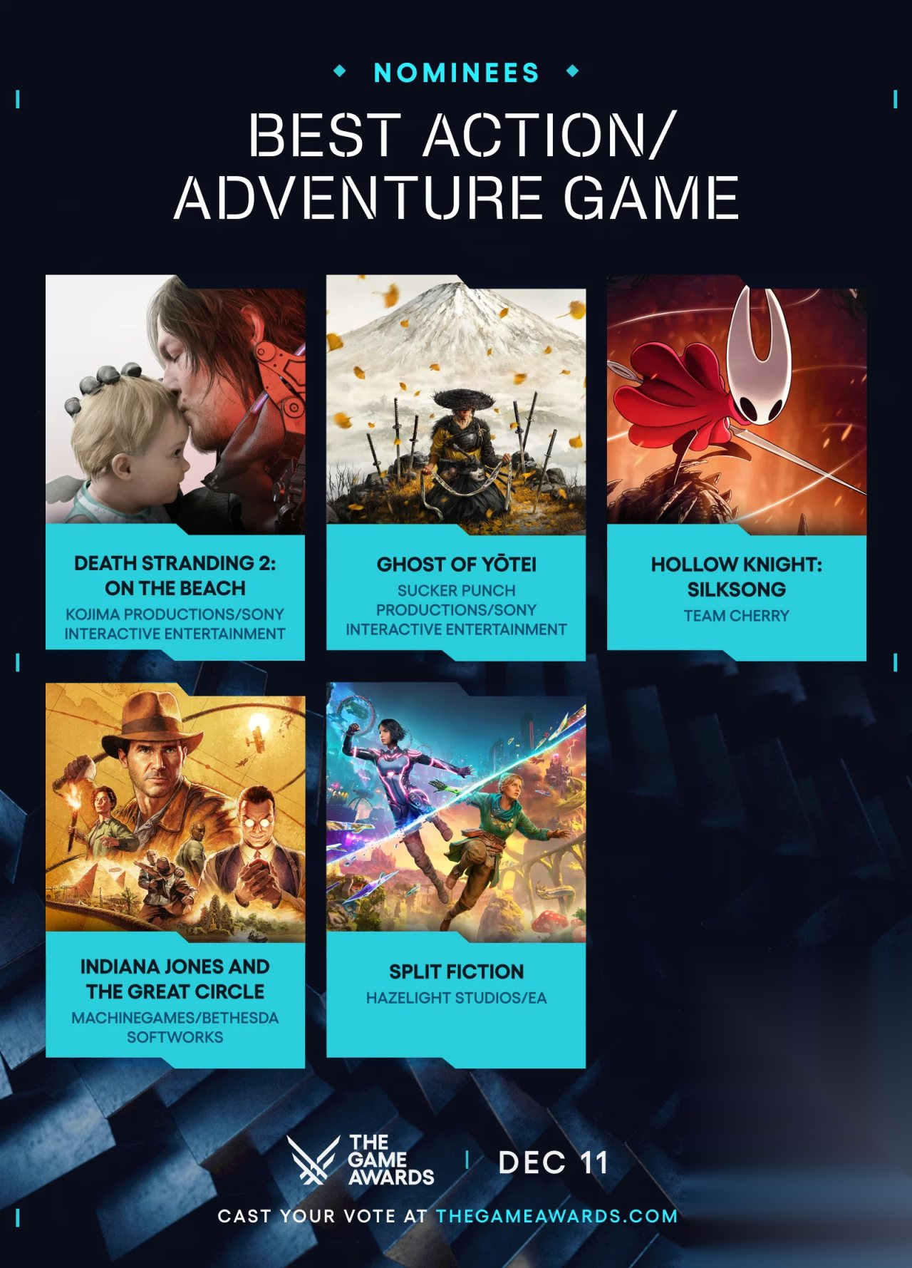 最佳动作/冒险游戏《死亡搁浅2:冥滩之上》《羊蹄山之魂》《夺宝奇兵:古老之圈》《空洞骑士:丝之歌》《双影奇境》