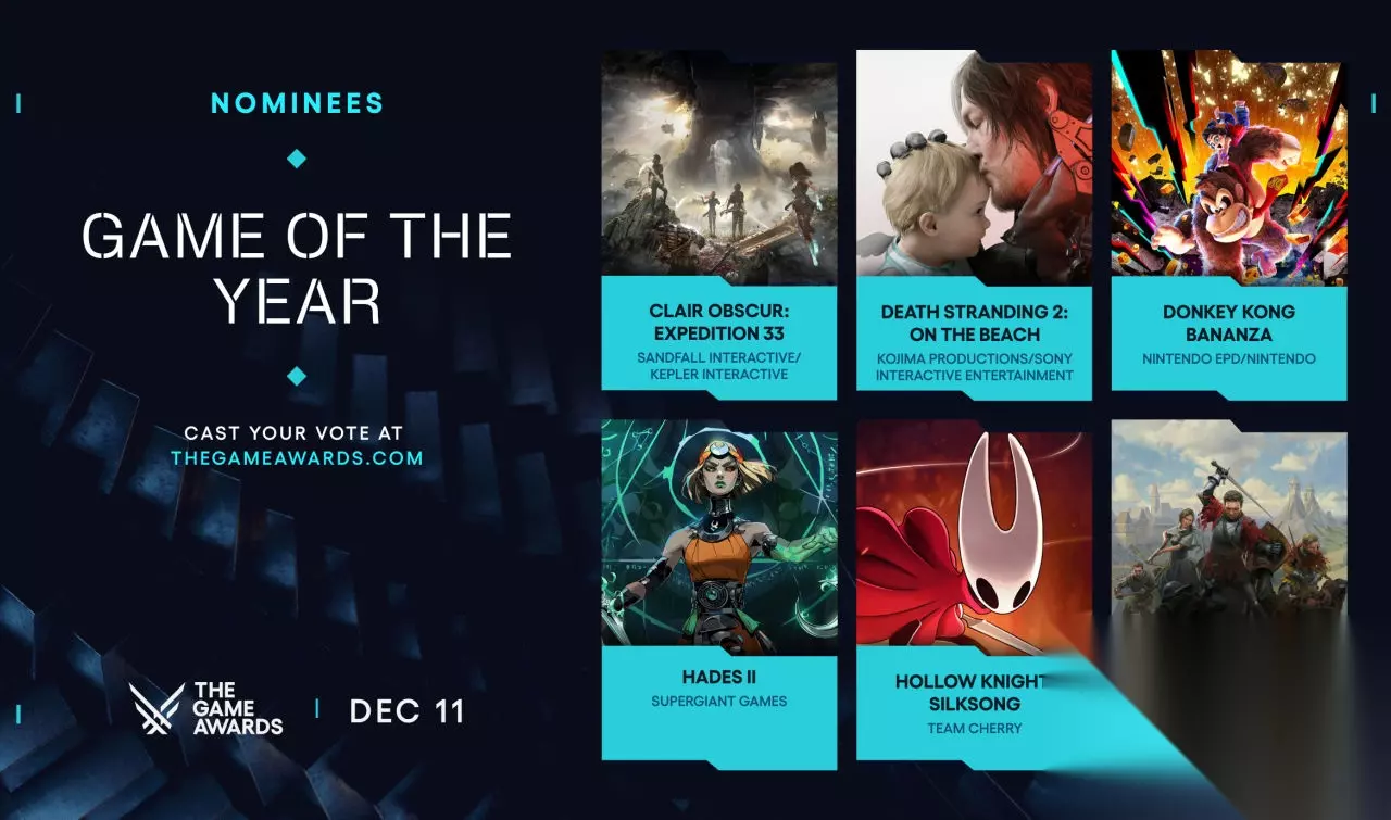The Game Awards(TGA)是由加拿大籍游戏媒体人杰夫·吉斯利主办并主持的电子游戏奖项,以表彰全球过去一年内发售的优秀电子游戏。其中,“年度最佳游戏”被视为电子游戏产业中最为重要的荣誉之一。颁奖典礼将于北京时间 12 月 12 日 8:30 在美国洛杉矶孔雀剧院举行,时长约3.5小时。年度最佳游戏《光与影:33号远征队》《死亡搁浅2:冥滩之上》《咚奇刚:蕉力全开》《黑帝斯2》《空洞骑士:丝之歌》《天国:拯救2》