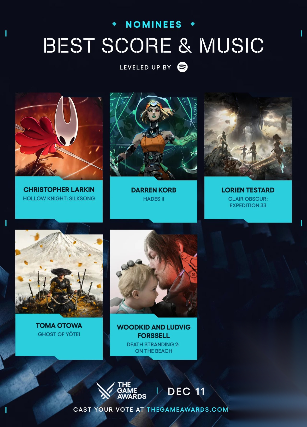 最佳配乐《空洞骑士:丝之歌》《哈迪斯2》《光与影:33号远征队》《羊蹄山之魂》《死亡搁浅2:冥滩之上》