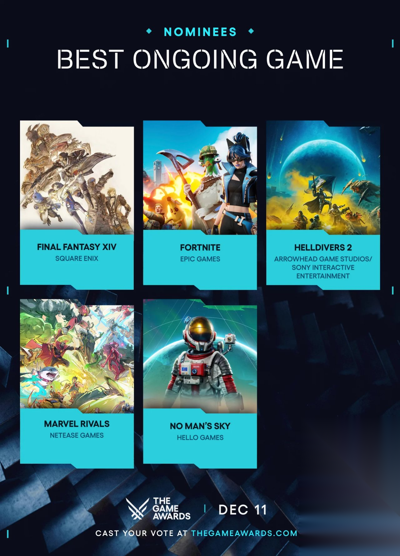 最佳持续运营《最终幻想14》《堡垒之夜》《地狱潜兵2》《漫威对决》《无人深空》