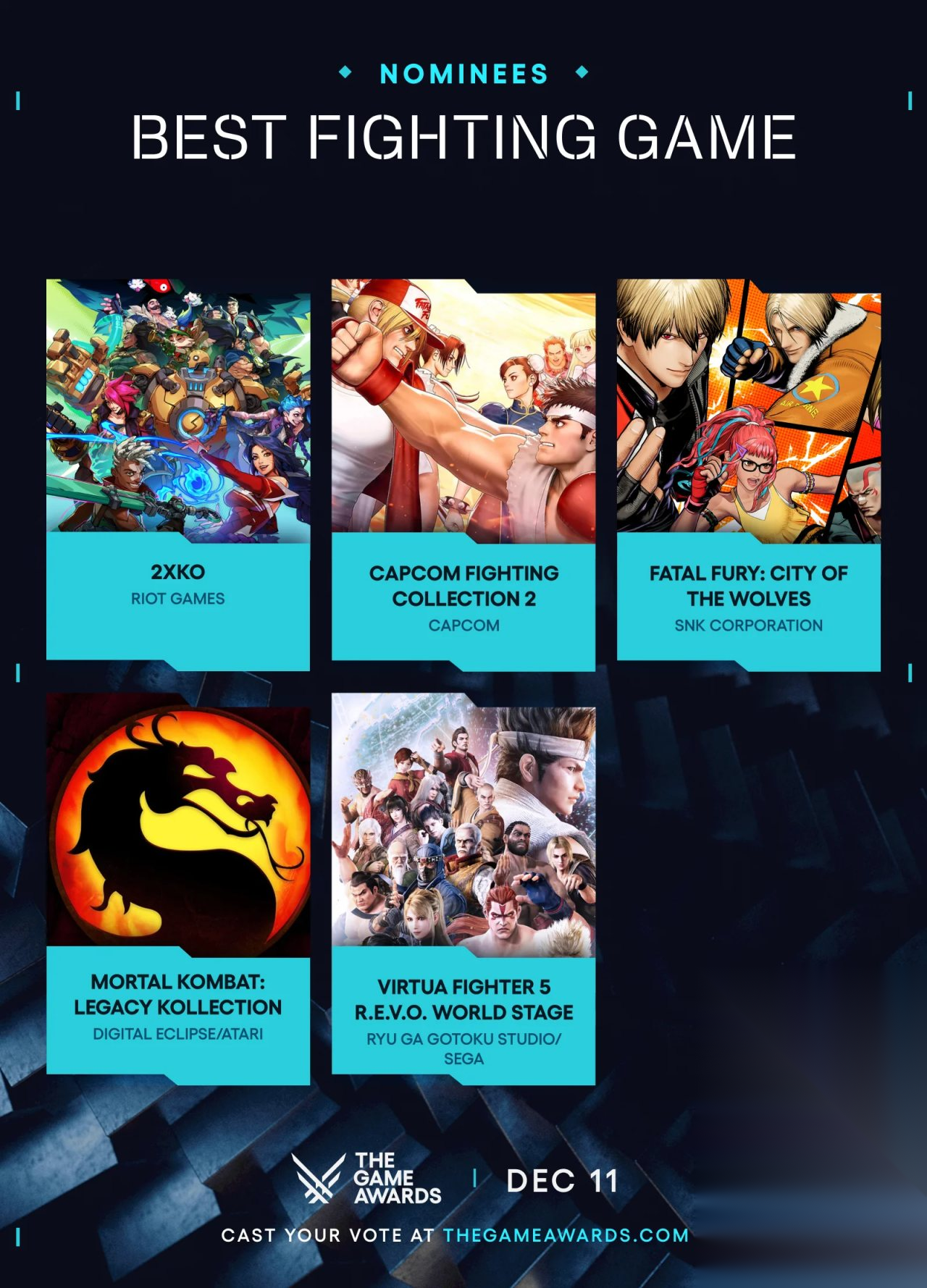 最佳格斗游戏《2XKO》《卡普空街机合集2》《饿狼传说:群狼之城》《真人快打:传奇合集》《VR战士5 R.E.V.O. World Stage》