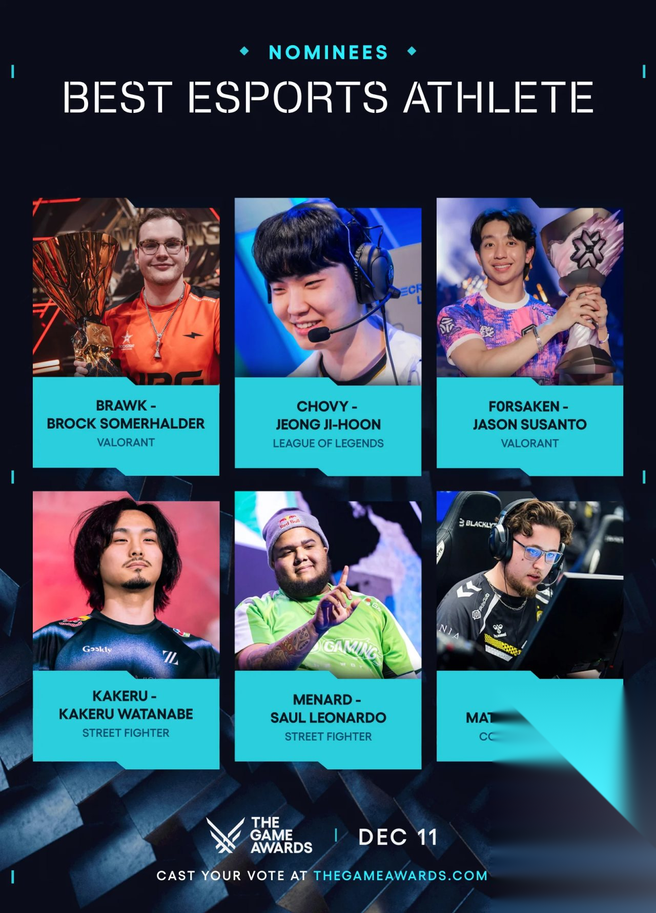 最佳电竞选手brawk - 《无畏契约》Chovy - 《英雄联盟》f0rsakeN - 《无畏契约》Kakeru - 《街头霸王》MenaRD - 《街头霸王》Zyw0o - 《反恐精英2》