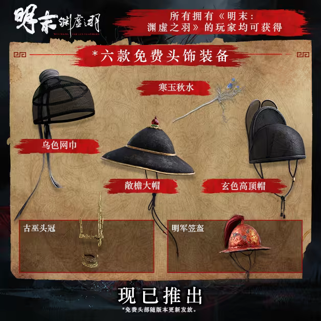 所有拥有《明末: 渊虚之羽》的玩家均可获得:乌色网巾寒玉秋水敵檐大帽玄色高顶帽古巫头冠明军笠盔