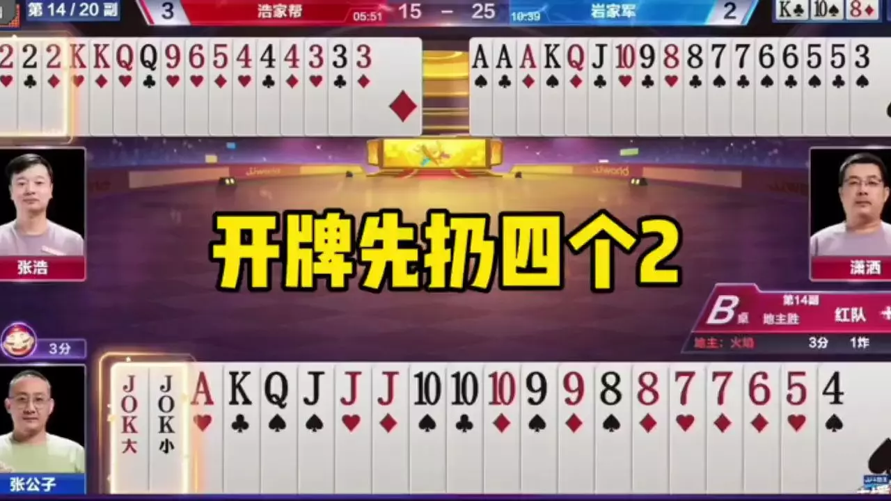 这是JJ斗地主S8春季赛24进16A组的对局,河北锦官城与山西沁州虎对战,第7副牌中选手长考后出牌,展现了斗地主赛事中的策略博弈,长考的策略似乎起到了作用。