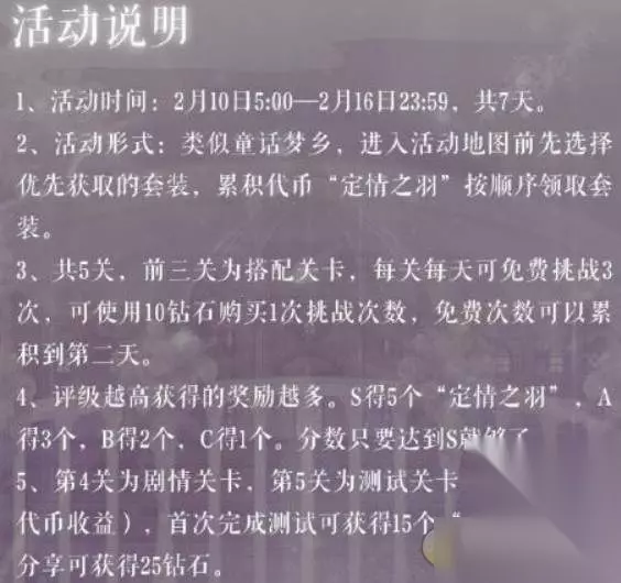 奇迹暖暖情人节主要的主题就是3个关卡进行搭配服装的哦!但是3个关卡都是非常困难的搭配,所以不少玩家不知道怎么搭配,所以小编为大家详细介绍一下! 奇迹暖暖2019年情人节3大关卡搭配方法一览 活动说明 1、活动时间:2月10日5:00-2月16日23:59,共7天。 2、活动形式:类似童话梦乡,进入活动地图前先选择优先获取的套装,累积代币“定情之羽”按顺序领取套装。 3、共5关,前三关为搭配关卡,每关每天可免费挑战3次,可使用10钻石购买1次挑战次数,免费次数可以累积到第二天。 4、评级越高获得的奖励越多。S得5个“定情之羽”,A得3个,B得2个,C得1个。分数只要达到S就够了。 5、第4关为剧情关卡,第5关为测试关卡(搭配不影响代币收益),首次完成测试可获得15个“定情之羽”,分享可获得25钻石。