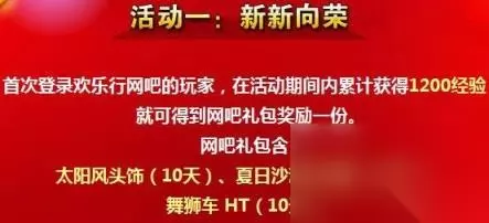 下面是小编整理的关于跑跑卡丁车网吧欢乐行 欢天喜地迎国庆攻略内容,介绍了跑跑卡丁车网吧欢乐行活动介绍,跑跑卡丁车网吧欢乐行欢天喜地迎国庆等内容。 跑跑卡丁车网吧奖励 这次的活动完全是为了给大家庆祝国庆期间的无聊来举办的,不过要在欢乐行网吧玩游戏才能获得奖励,这还是有点难的,毕竟很多人去网吧还是有条件限制的,一起来看看活动内容吧! 活动时间:9月29日-10月8日 活动内容: 1、新新向荣 首次登录欢乐行网吧的玩家,在活动期间内累计获得1200经验,就可得到网吧礼包奖励一份。