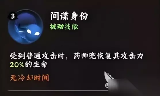 再看他的被动技能之一间谍身份,每当药师兜受到普通攻击时,便会依据自身攻击力的20%恢复生命值,而且这一效果毫无冷却时间的限制,这意味着在战斗中,药师兜能够凭借频繁触发的生命回复机制,持续维持自身的血量健康,极大地增强了他在战场上的生存能力。无论是面对敌人的零星打击还是密集火力,他都能凭借这一技能顽强地站立在前线,为队友分担压力。