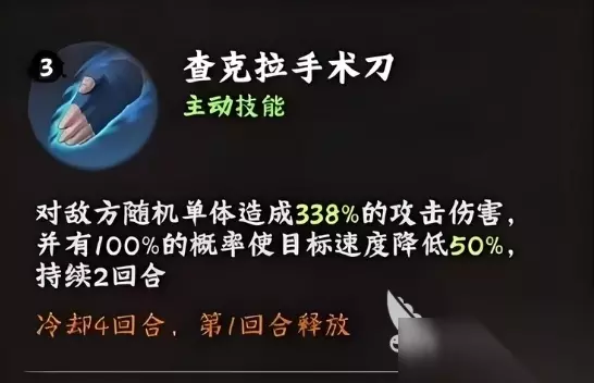 药师兜尽管其初始品质仅为S级,但对于广大平民玩家而言,这丝毫不影响他在阵容构建中的重要地位,毕竟S级角色培养成本低廉且易于上手,由于体质相对较弱,药师兜仅拥有三个技能,然而正是这些看似简约的技能组合,在战斗中带来的效果反而不错,他的主动技能查克拉手术刀,能够对敌方随机单位造成高达338%攻击力的可观伤害,并且附带100%使目标速度降低50%的强大效果,这一减速状态将持续两回合之久。 该技能在战斗的第一回合即可果断释放,不过冷却时间需要四回合,值得一提的是,这里所介绍的是技能达到满级后的卓越效果,此时的它已然成为战场上改变节奏的关键所在,当此技能命中敌人后,不仅能直接削减对方的战斗力,还能通过大幅降低其速度来打乱敌方的进攻节奏,为我方创造有利的输出环境,其实目前很多玩家都是不太会用这个减速的,但是就目前而言减速带来的影响是比大家想象中要大的。