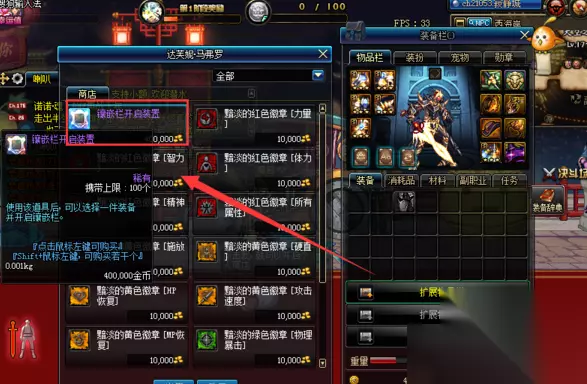 4、在该NPC的商店中购买道具“镶嵌栏开启装置”。然后游戏玩家就可以使用该道具为自己的装备开孔了。