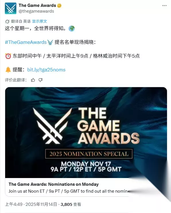 TGA2025提名游戏名单将于11月18日公布