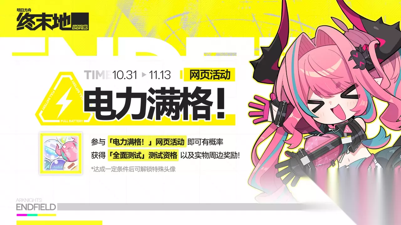 【电力满格!】网页活动现已开启!参与网页活动并完成任务,即可抽取「全面测试」测试资格、国行PlayStation®5数字版主机、实物周边等奖励,期待管理员的参与~ 达成一定条件后还可解锁全球特殊头像奖励,已解锁奖励将在游戏正式上线后,通过游戏内邮件发送给全服务器全平台的管理员,详情请见活动规则。活动链接:网页链接活动时间:10月31日20:00~11月13日23:59