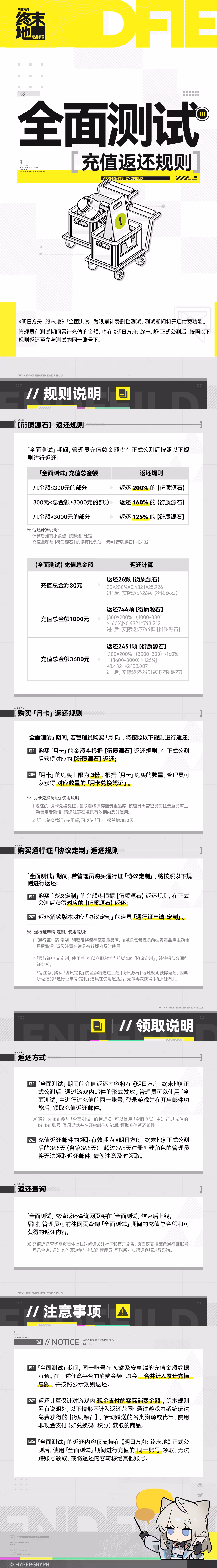 全面测试 充值返还规则管理员在测试期间累计充值的金额,将在《明日方舟:终末地》正式公测后,按照以下规则返还。管理员可查看「全面测试」充值返还规则以了解具体信息。
