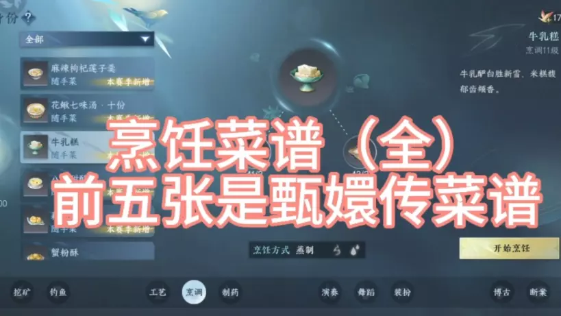 火焰蜜汁烤翅 蜂蜜烤羊腿 海鱼黄金焗饭 香草战斧牛排 果香烤乳猪 香草风味烤扇贝 奶油蘑菇炖饭 浓香烤全鸡 盐烤海虾 红酒鹿肉炖汤 甜奶油蛋派 墨汁海鲜意面 奶油蟹粉面 香煎怪肉排 幽兰秘制肉卷 年年有鱼 招财进宝汤饺 我好饿啊好想急头白脸的冲进游戏里吃一顿 酒心果子露 浓醇提拉米苏 香浓可可混莓果冻 迷迭香风味沙拉 神秘姜饼人 冰皮银枝果月饼