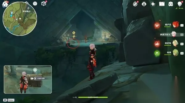 位置:在层岩巨渊主矿区下方传送点,东南方向的树根处,是解谜宝箱,2.6版本就拿过了。 在传送点朝正前方飞,在愚人众房子上面有仙灵柱的地方,墙边有炸药桶炸开墙就可以进来了,点亮三个元素方碑,开启宝箱即可获得隐藏成就【生命之谷的居民】。 开启元素视野,可以看到3个光点,触碰即可解封方碑。